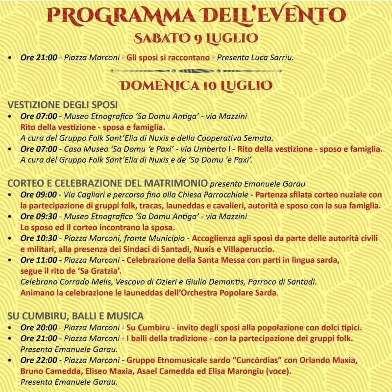 • Ore 10:30 - Piazza Marconi, fronte Municipio - Accoglienza agli sposi da parte delle autorità civili e militari, alla presenza dei Sindaci di Santadi, Nuxis e Villa peruccio.