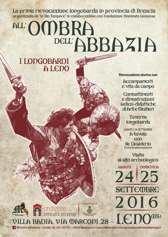 A Leno (Brescia), dove il popolo longobardo si è stanziato e il suo re Desiderio ha fondato un monastero benedettino che per secoli ha posto il suo dominio su buona parte del nord Italia, sabato 24 e domenica 25 settembre 2016 si terrà la grande rievocazione longobarda “All’ombra dell’abbazia”, organizzata dall’Associazione In Illo Tempore, con la collaborazione della Fondazione Dominato Leonense, di Cassa Padana e il Patrocinio del Comune di Leno.