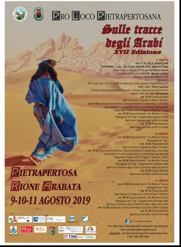 Il 09, 10 e 11 Agosto 2019, Pietrapertosa, paese più alto della Basilicata nonché uno dei borghi più belli d‘Italia tra le vette delle Dolomiti lucane, aprirà le porte del suo rione più antico: l‘Arabata, con la manifestazione “Sulle tracce degli Arabi”.