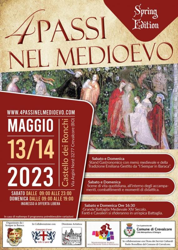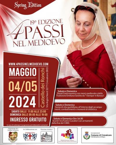 Torna Quattro Passi nel Medioevo a Crevalcore (BO) 4 e 5 maggio 2024 a Villa Ronchi di Crevalcore (BO): Artigiani e mercanti, armati e popolani ridaranno vita al medioevo a cavallo tra il 1380 e il 1410. Nel grande accampamento si assisterà a scene di vita quotidiana. Nel mercato storico, abili artigiani esporranno e mostreranno le lavorazioni di un’epoca così lontana. Momenti di didattica sulle armi e l’artigianato si alterneranno a scene di intrattenimento teatrale e musicale. Non perdere questa grande festa per comprendere e forse rivalutare questa parte della nostra storia così grande ed importante. L’ingresso è gratuito.
