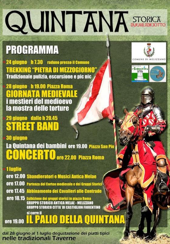 La sfilata storica attraverserà le strade cittadine, aprendo la scena al Palio della Quintana, cuore dell'evento in cui le cinque contrade di Melizzano si fronteggiano con i propri combattenti armati di lancia, che corrono a cavallo puntando contro una sagoma rappresentante un Saraceno con l’obiettivo di infilare un anello che si restringe ad ogni passaggio.