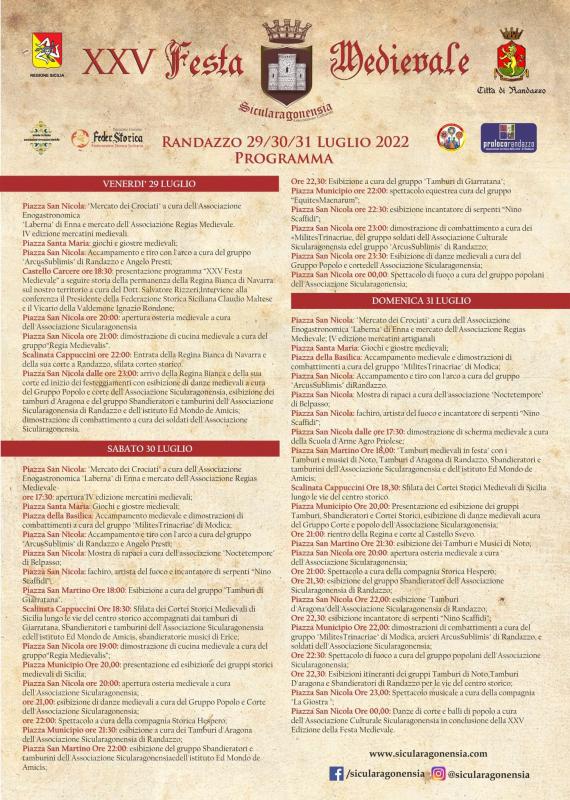 L’evento verrà animato da gruppi storici, giocolieri di fuoco, accampamenti medievali, musici itineranti, gare di arcieri, esibizioni di falchi, un mercato con banchi e mestieri dell’epoca, spettacoli equestri e tanto altro. Sarà possibile ristorarsi negli angoli più caratteristici del centro storico, dove saranno dislocate le taverne che offriranno pasti e bevande d’ispirazione medievale. Anche le chiese, per l'occasione, rimarranno aperte, per permettere a tutti i visitatori di ammirare gli splendidi monumenti della città di Randazzo.