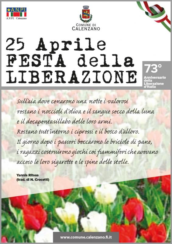 Un programma ricco di eventi, che inizia il 24 aprile per protrarsi fino al 19 maggio, per celebrare il 73° anniversario della Liberazione dell’Italia dal nazifascismo. Promosso dal Comune in collaborazione con l’Anpi di Calenzano.