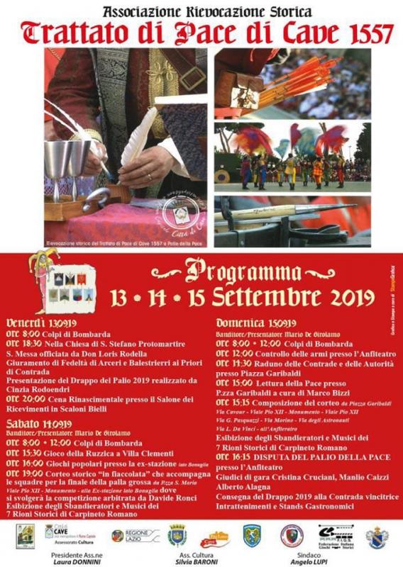Rievocazione Storica, Lettura della Pace a Piazza Garibaldi, Corteo Storico e arrivo all’Anfiteatro di Piazza D’Acquisto con Disputa del Palio della Pace tra arcieri e balestrieri delle antiche Contrade di Cave, spettacolo di Sbandieratori e Consegna del Drappo del Palio alla Contrada vincitrice, Giochi Popolari tra le antiche contrade.