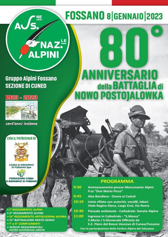 Si terranno domenica 8 gennaio 2023 a Fossano le celebrazioni dell’80esimo Anniversario della Battaglia di Nowo Postojalowka. Le Penne Nere si riuniranno al cospetto del Castello degli Acaja per ricordare il sacri-ficio degli Alpini della Divisione Alpina Cuneense caduti e dispersi in Russia durante la Seconda Guerra Mon-diale.