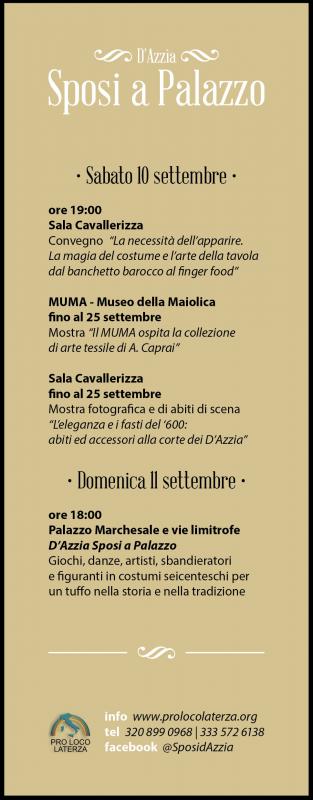 Nella suggestiva cornice del Palazzo Marchesale e del centro storico di Laterza l'evento rievoca l'arrivo dei marchesi Giuseppe d'Azzia e Isabella Aldano nel 1610.