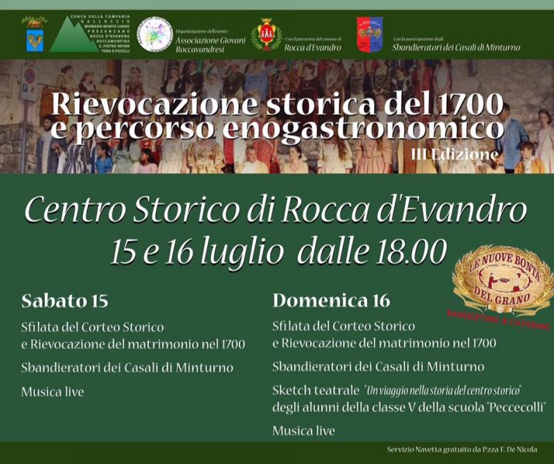 Nella meravigliosa cornice del centro storico di Rocca d'Evandro, tra costumi d'epoca e rappresentazioni, tra sbandieratori e suono dei tamburi, sarà possibile viaggiare nel tempo.