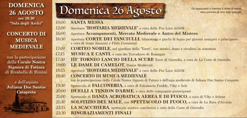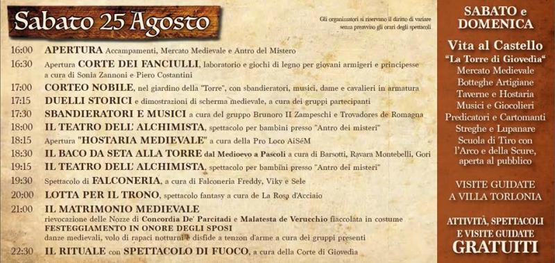 Ad una settimana dall'inizio di quella che si prospetta una spettacolare 3^ Edizione Festa Medievale "La Torre di Giovedìa", siamo lieti di presentarvi il programma completo di questa fantastica 3 giorni in quel di Villa Torlonia - Parco Poesia Pascoli, in cui noi della Corte di Giovedìa e la Proloco Aisem di San Mauro Pascoli vi faremo emozionare con spettacoli, duelli, cantastorie, buon cibo, falchi, mercanti, musica e decine di altre attrazioni.