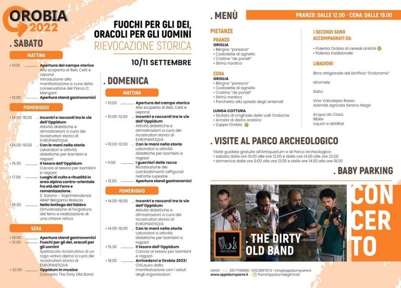 Grazie a un programma articolato che abbina momenti di approfondimento scientifico con interventi di alto contenuto culturale ad attività didattiche per bambini e ragazzi, laboratori, visite guidate, musica e cucina, Orobia intende far conoscere e sperimentare gli usi e costumi e la cultura delle popolazioni presenti nell’Italia Settentrionale tra la fine del II e il I millennio a.C sia agli appassionati sia a un pubblico meno preparato e di settore.