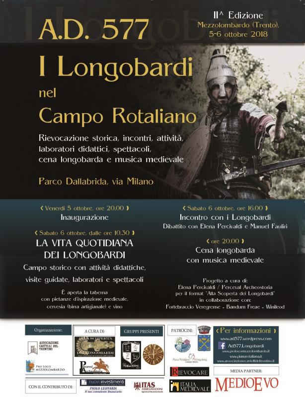 Torna a Mezzolombardo (Trento) l’appuntamento con “A.D. 577 – I Longobardi nel Campo Rotaliano”, quest’anno giunto alla seconda edizione. L’evento storico-rievocativo, in programma il 5-6 ottobre 2018, trae spunto dalla battaglia combattuta nell’anno 577 tra i Franchi e i Longobardi la cui memoria è tramandata dal massimo storico della gens Langobardorum, Paolo Diacono.