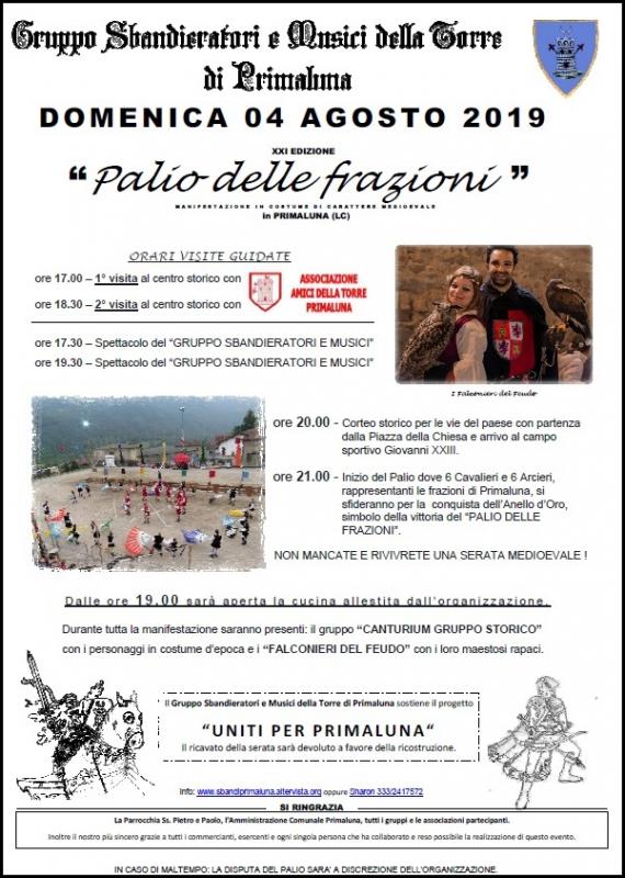 ore 21.00 - Inizio del Palio dove 6 Cavalieri e 6 Arcieri, rappresentanti le frazioni di Primaluna, si sfideranno per la conquista dell’Anello d’Oro, simbolo della vittoria del “PALIO DELLE FRAZIONI”.