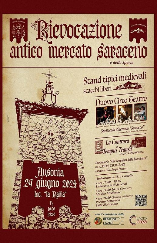 Vi aspettiamo Sabato 29 Giugno a partire dalle ore 16:00 con stand tipici medievali, artisti di strada, laboratorio di scacchi, musica e la quarta edizione del Premio Letterario Città di Ausonia ‘Ad Duos Leones’.