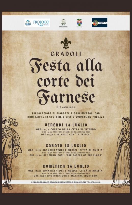 A Gradoli in provincia di Viterbo si svolge nei giorni Venerdì 14, Sabato 15 e Domenica 16 Luglio 2023 la 12a edizione della Festa alla Corte dei Farnese per assaporare l'atmosfera rinascimentale tra mercatini di Mercante in fiera, artisti di strada, musici e sbandieratori.