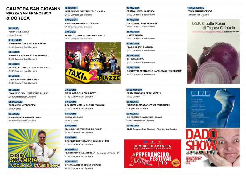 Ecco i numeri: da luglio a settembre ad Amantea avranno luogo oltre 50 eventi, mentre a Campora San Giovanni saranno circa 35. Per la gioia degli appassionati, le sagre terranno banco sia nel mese di luglio, sia ad agosto, spaziando dalle pietanze di mare a quelle più tipiche dell’entroterra. Confermatissimi gli appuntamenti storicizzati che hanno consentito alla città di Amantea di farsi apprezzare in ambito nazionale ed internazionale, come la “Festa degli amanteani nel mondo” (6 agosto), la “Grotta dei desideri” (dall’1 al 4 agosto), la “Guarimba international film festival” (dal 7 all’11 agosto), le finali scudetto di beach volley (dal 25 al 28 agosto), il “Festival scacchistico internazionale” (dal 4 all’11 settembre). Ed ancora il “Peperoncino jazz festival” (24 e 25 agosto) le due notti bianche in programma a Campora San Giovanni il 16 agosto e ad Amantea il 18.