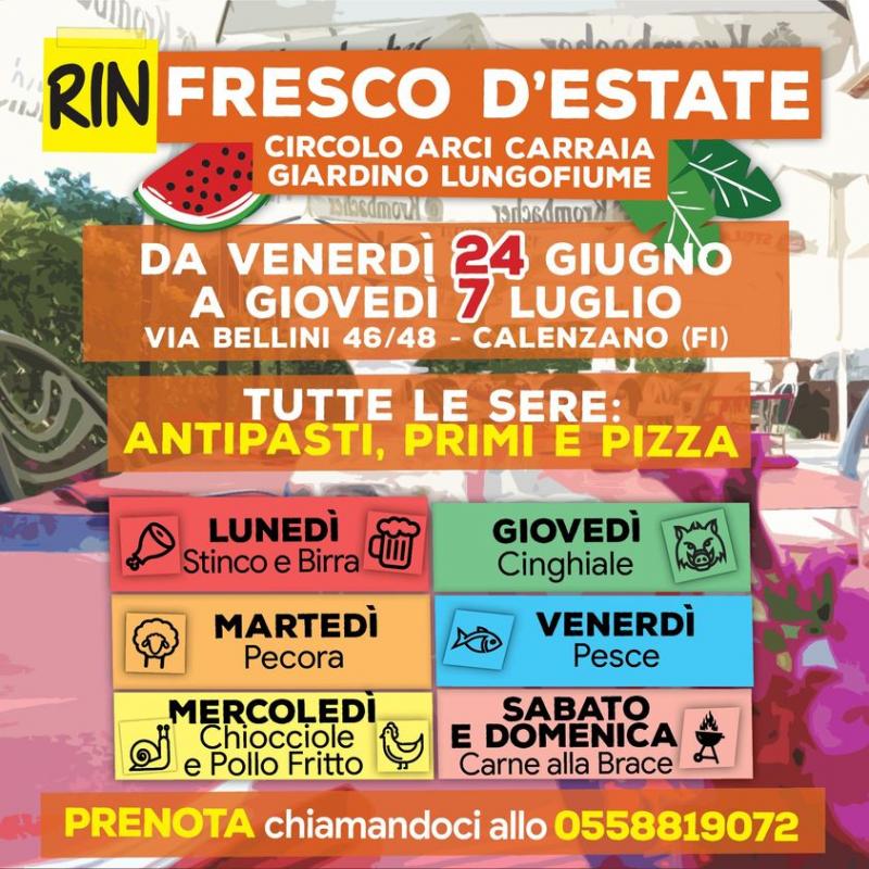dal 24 Giugno al 7 Luglio al Circolo ARCI Carraia per cenare nel nostro fresco giardino estivo con le specialità del RIN...FRESCO D'ESTATE!