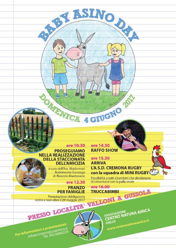 L’Associazione Centro Natura Amica Onlus come ormai di consueto dedica la prima festa della stagione ai bambini, invitando grandi e piccini nel contesto naturalistico golenale di Località Valloni per partecipare DOMENICA 4 GIUGNO all’evento del BABY ASINO DAY.