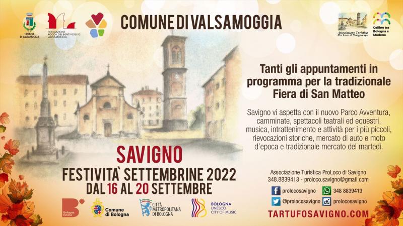 Tanti appuntamenti in programma per le festività legate alla tradizionale fiera di San Matteo. Savigno vi aspetta con il nuovo Parco Avventura, camminate, spettacoli teatrali ed equestri, musica, intrattenimento e attività per i più piccoli, rievocazioni storiche, mercato di auto e moto d'epoca e tradizionale mercato del martedì.