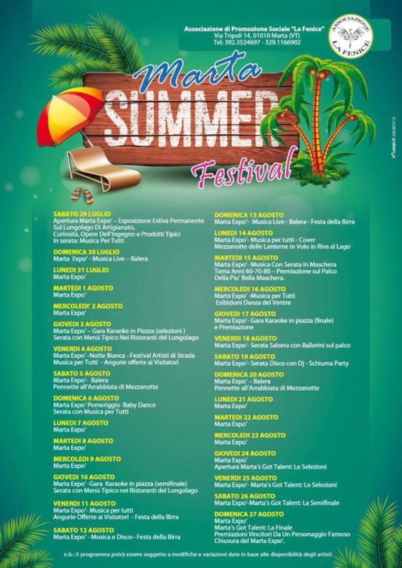 Per l'estate 2017 si svolge Marta Expò con mercatino permanente e eventi musicali dal 29 luglio al 27 agosto 2017.