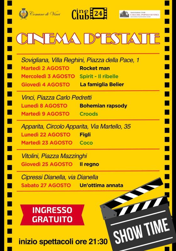 Il ricco calendario, che si potrà arricchire nel corso delle settimane di nuovi appuntamenti, prevede Museolab, laboratori per famiglie in visita al Museo Leonardiano Vinci (tutti i giovedì di luglio, ore 10.30 e ore 12 e tutti i martedì e i giovedì ore 10.30 e ore 12 di agosto), il Gala dell'Opera italiana (8 luglio, ore 21.15 Piazza Guido Masi, Vinci), le attività per i più piccoli de La Domenica Leonardiana" (10 luglio, 14 agosto, 11 settembre), Le stelle in piazza, osservazioni celesti a cura del Gruppo Astrofili di Montelupo (7 e 14 luglio), la rassegna musicale Le notti del jazz (9 e 23 luglio), le letture Spuntano i libri (5, 12 e 20 luglio dalle 17 alle 19.30), Cinema d'estate, la rassegna cinematografica all'aperto (2-27 agosto), la Festa dello Sport (18 settembre).