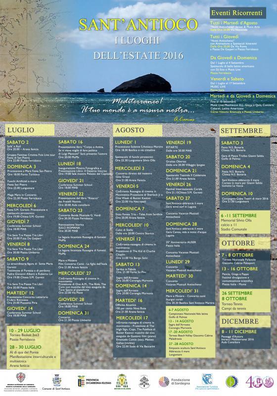 Il calendario degli Eventi a Sant'Antioco inizia a luglio e termina a dicembre 2016 con manifestazioni di ogni tipo: musica, cinema, spettacoli, tradizione, enogastronomia.