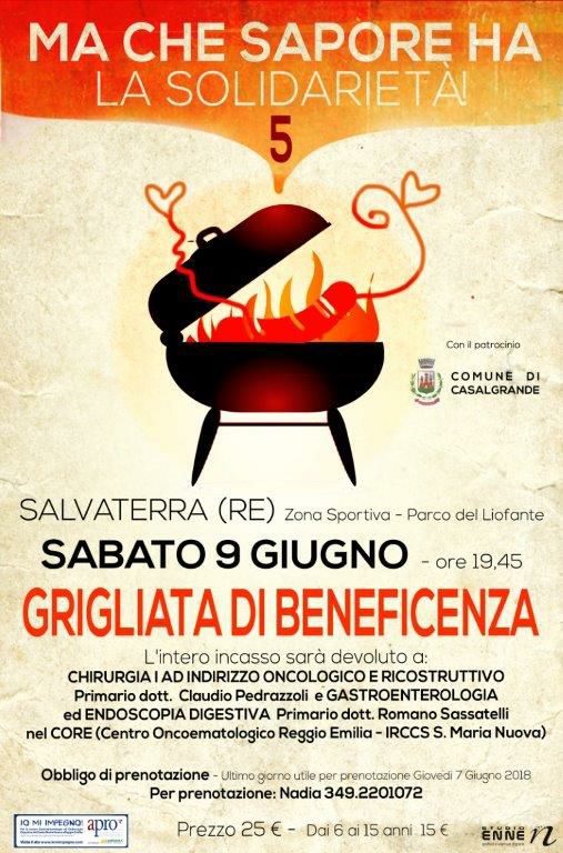 Sabato 09 Giugno alle ore 19.45 con il patrocinio del comune di Casalgrande presso la zona sportiva parco del Liofante di Salvaterra, dopo gli ottimi risultati degli ultimi anni quando hanno partecipato all’iniziativa ogni volta oltre 700 persone e sono stati devoluti più di 45.000 euro, siamo pronti per la quarta edizione della grigliata di beneficenza “CHE SAPORE HA LA SOLIDARIETA”.