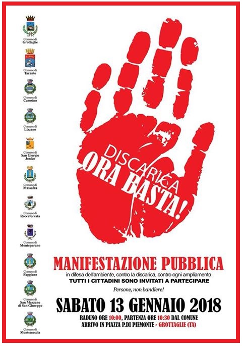 Di fronte alla mancanza di rispetto da parte della società stessa verso il territorio (continua a sversare senza pagare le royalties), e all’evidente situazione di sofferenza in cui verte tutto il circondario jonico, per la prima volta nella storia tutti i Comuni, con Grottaglie capofila, in coordinamento con le associazioni del territorio, scenderanno in strada e nelle piazze per portare avanti il loro NO su ogni tipo di innalzamento o ampliamento della discarica.