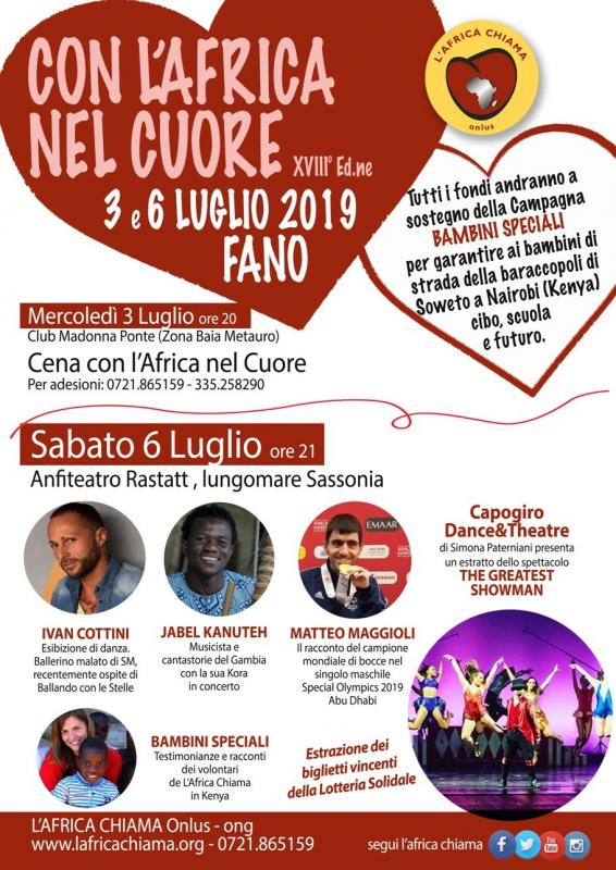 Giunta alla sua diciottesima edizione torna la manifestazione “Con l’Africa nel Cuore” promossa dalla onlus L’Africa Chiama, impegnata dal 2001 in progetti di cooperazione in Kenya, Tanzania e Zambia. In particolare questa edizione è interamente dedicata al progetto “Bambini Speciali” per garantire ai bambini di strada delle periferie di Nairobi (Kenya) cibo, scuola e futuro. Tutti i fondi raccolti in occasione degli appuntamenti previsti e attraverso la Lotteria Solidale verranno destinati in Kenya, dove, fra i numerosi interventi, l’associazione è impegnata nella riabilitazione di bambini di strada. “Solo nel 2018 sono stati 177 i bambini che hanno frequentato il nostro centro diurno; ad 87 bambini abbiamo garantito la frequenza scolastica pagando tutte le spese previste e sono stati 17 i bambini che abbiamo iscritto a scuola, abbandonando definitivamente la strada.”