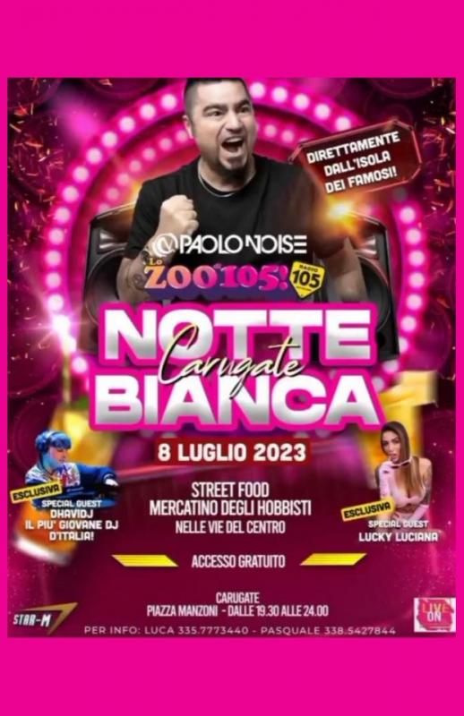 In Piazza Manzoni a Carugate in provincia di Milano si svolge nella giornata di Sabato 08 Luglio 2023 la Notte Bianca.