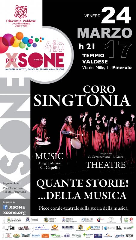 Prende il via il progetto XSONE 4.0 e lo fa, come da consuetudine, con un concerto. Protagonisti della serata, in programma venerdì 24 marzo, alle 21, presso il Tempio Valdese di Pinerolo è il Coro Singtonia di Torino. Il Coro, diretto da Caterina Cappello, è composto da 28 elementi e da 20 anni propone concerti e attività musicali in Piemonte e dintorni, partecipando ai festival corali e internazionali di Praga, Salisburgo, Amsterdam e Cork. Musica Spiritual, Etnica e Pop eseguita a cappella sono fonte di ispirazione per il repertorio del Coro Singtonia.
