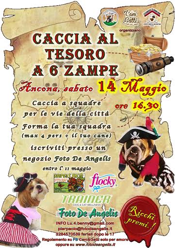 "Caccia al tesoro a 6 zampe" è organizzata dall’Associazione Cani & Gatti onlus, Qua la Zampa onlus di Castelfidardo e Centri cinofili Anconetani ASD.