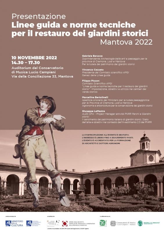 Dopo pochi giorni, e precisamente nel pomeriggio di giovedì 10 novembre 2022, promossa dalla Soprintendenza Archeologia, belle arti e paesaggio per le province di Cremona, Lodi e Mantova, in collaborazione con APGI Associazione Parchi e Giardini d’Italia e Orticola di Lombardia si terrà l’incontro per la presentazione delle Linee guida e norme tecniche per il restauro dei giardini storici, adottate dal Ministero della Cultura lo scorso 20 dicembre 2021 ed elaborate da un gruppo di lavoro congiunto MiC - APGI (www.apgi.it).