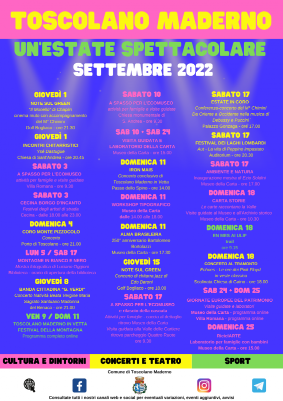 Diniego di responsabilià: le notizie riportate in questa pagina sono state fornite da Enti Pubblici e Privati e, organizzazione eventi e sagre, fiere. Suggeriamo di verificare date, orari e programmi che potrebbero variare, contattando le organizzazioni o visitando il sito ufficiale dell'evento.