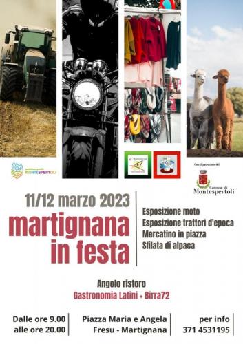 Il ricco calendario che parte con sabato 11 e domenica 12 marzo con “Martignana in festa”. Due giorni di iniziative in piazza Maria e Angela Fresu, con l’esposizione di moto e trattori d’epoca, mercatino, sfilata di alpaca e un punto ristoro con il contributo di Gastronomia Latini e Birra 72.