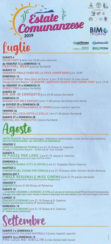 Da Lunedì 01 Luglio a Sabato 14 Settembre 2019 -