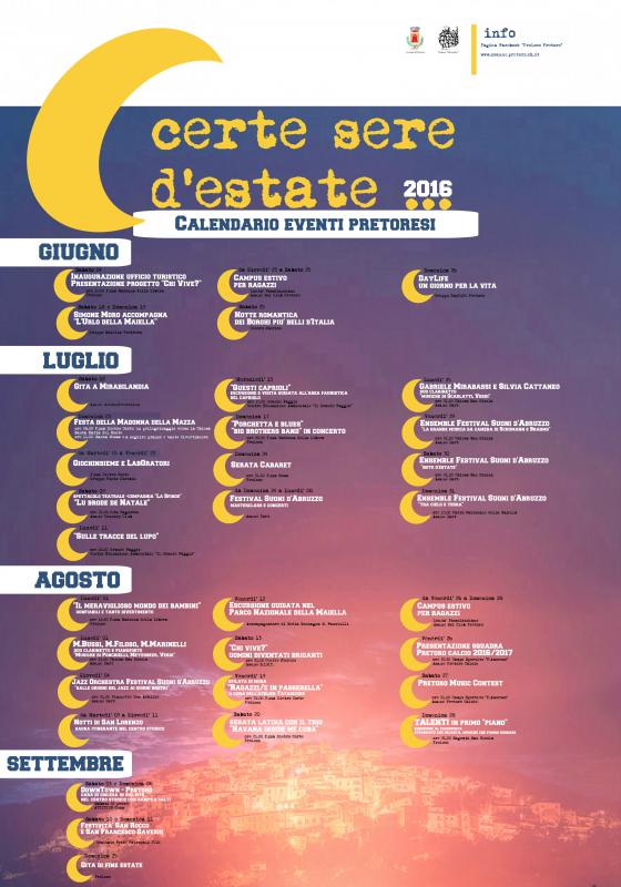Gli eventi dell'Estate Pretorese 2016 iniziano il 4 giugno e terminano il 25 settembre 2016, secondo il calendario riportato nella locandina.