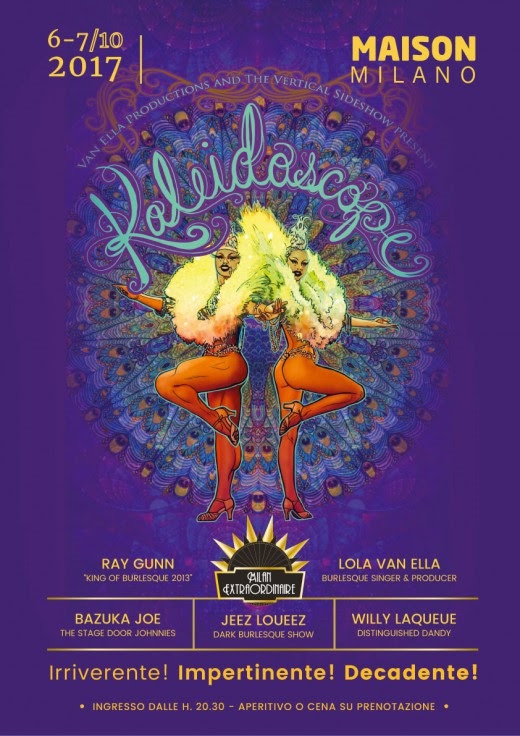 Il cast di Kaleidoscope presenta alcuni tra i più famosi artisti della scena mondiale del Burlesque, del circo e del varietà: Ray Gunn, “King of burlesque 2013”; Jeez Loueez, Miss Viva Las Vegas; Bazuka Joe, membro della “Best Troupe” al Burlesque Hall of Fame, l’Oscar del burlesque; Lola Van Ella, cantante, presentatrice e produttrice del Show-me Burlesque & Vaudeville Festival; Willy Laqueue, sfavillante dandy d’altri tempi.