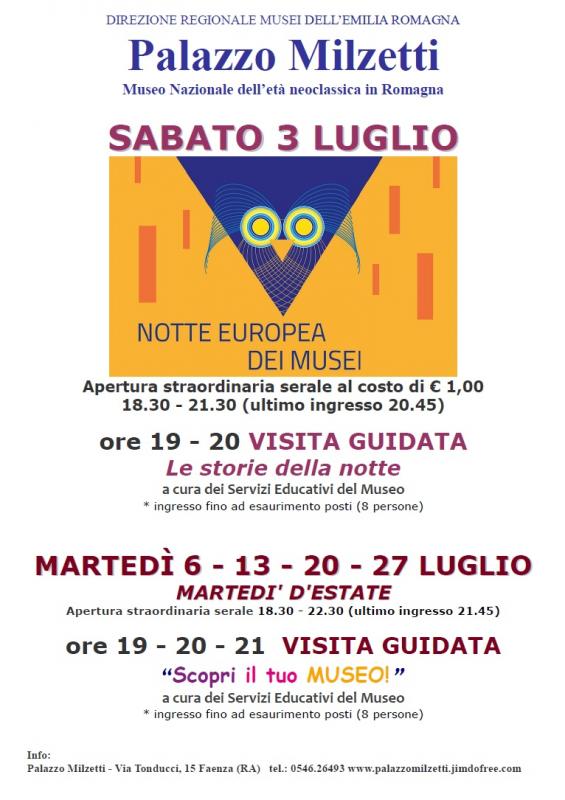 Palazzo Milzetti organizza una serie di appuntamenti dedicati ai turisti e ai faentini che restano in città. Il museo prende parte all’evento europeo “La Notte dei Musei” e ai Martedì d’estate, proponendo diverse aperture straordinarie serali, in cui saranno offerti al pubblico conversazioni, racconti e visite guidate alla scoperta delle bellezze e delle curiosità del museo.
