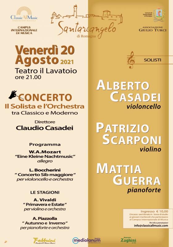 L’associazione Musicale Classicallmusic in collaborazione con il Comune di Santarcangelo, organizza in ambito del Campus internazionale di Musica un concerto di Musica classica Il Solista e l’Orchestra, diretti dal Maestro Claudio Casadei, violoncellista e docenti al Conservatorio G. Rossini di Pesaro.