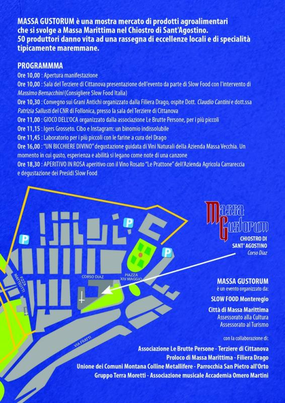 Massa Gustorum è organizzata da Slow Food Monteregio e dal Comune di Massa Marittima nel contesto dell’annuale protocollo d’intesa per la valorizzazione dei prodotti locali; sarà aperta liberamente a tutti dalle ore 10 alle ore 20 di Domenica 10 Giugno.