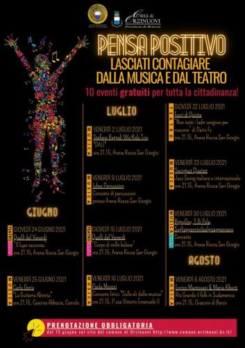 Dal 24 giugno fino al 6 agosto 2021, Orzinuovi e le frazioni di Coniolo e Barco saranno il palcoscenico di una ricca rassegna di dieci spettacoli dal vivo, dal titolo “Pensa Positivo - Lasciati contagiare dalla musica e dal teatro”. L’Amministrazione comunale e l’Assessorato alla Cultura saranno lieti di offrire gratuitamente ai propri cittadini, e non solo, un’iniziativa di qualità che si carica di voglia di ripartire insieme con entusiasmo. Gli appuntamenti proposti coinvolgeranno professionisti del territorio, di fama anche internazionale, scelti con l’intento di soddisfare diversi gusti musicali e generi teatrali, e di intrattenere più fasce d’età.