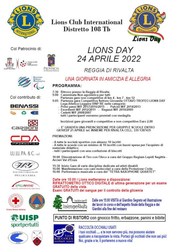 La manifestazione, realizzata in collaborazione con Comune di Reggio Emilia, Provincia, Comitato italiano paralimpico della Regione Emilia Romagna e Associazione Insieme per Rivalta, è organizzata dagli oltre 300 soci degli 11 Club Lions reggiani. L’iniziativa, infatti, rappresenta per i Lions l’occasione di incontrare le famiglie e presentare le tante attività di servizio – in ambito sanitario, educativo, sportivo, culturale e artistico – realizzate tutto l’anno insieme alle associazioni e alle istituzioni locali a favore dei Cittadini e della Comunità.