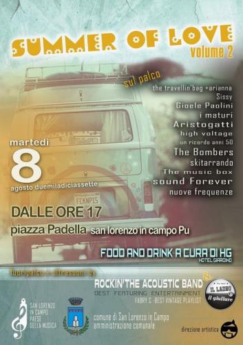 Nove ore di musica, 11 band, oltre 40 musicisti in una piazza meravigliosa illuminata dalle stelle. A 50 anni dalla “Summer of Love”, la memorabile estate del '67 all'insegna della pace, dell'amore e della controcultura hippie, San Lorenzo in Campo, il “Paese della Musica”, in provincia di Pesaro e Urbino, rivivrà l’atmosfera unica di quell’estate, rigorosamente in stile “flower power”. Martedì 8 agosto, nella suggestiva cornice di piazza Padella, nel centro storico laurentino, andrà in scena “Summer of Love” volume 2, organizzata dall’Amministrazione Comunale. E’ l’ennesimo appuntamento musicale di un pentagramma sempre più ricco. Un successo straordinario la prima edizione, con la piazza stracolma di giovani e non solo. Il bis è stato naturale per l’amministrazione Dellonti che ormai da 3 anni sta portando avanti l’ambizioso progetto “Paese della Musica” per valorizzare e promuovere le grandi potenzialità musicali di San Lorenzo in Campo. La direzione artistica è di Leonardo “Lello” Landi uno dei musicisti più frizzanti della scena locale e non solo. A collaborare con lui la squadra degli Ocean’s 9. Tutte le band e gli artisti che si esibiranno proporranno almeno un brano inerente al tema, al titolo della serata “Summer of Love”. Si partirà presto, già alle 17 per dare spazio ai tantissimi musicisti. Presenterà Silvana Ceccucci. Sul palco di piazza Padella saliranno: The travellin’bag + Arianna, Sissy, Gioele Paolini, I maturi, Aristogatti, High voltage, Un ricordo anni 50, The Bombers, gli allievi di Skitarrando, The music box, Sound Forever, Nuove Frequenze. E durante la serata spazio anche a Il ladro e Il giullare, Rockin’The Acoustic Band e Fabry C. “E’ stato naturale – spiega il sindaco Dellonti – dare seguito alla meravigliosa prima edizione della “Summer of Love”. La festa della musica, che unisce e crea il senso di comunità. Questo evento che rientra nel “Paese della Musica”, progetto che con successo stiamo portando avanti, è una vetrina importante per i tantissimi musicisti laurentini, in particolare per i nostri giovani, che potranno esibirsi in una delle cornici più affascinanti del paese e davanti al pubblico delle grandi occasioni. Una serata durante la quale il “Paese della Musica” esprimerà tutte le sue enormi potenzialità”. Food e drink a cura del ristorante Giardino di San Lorenzo in Campo.