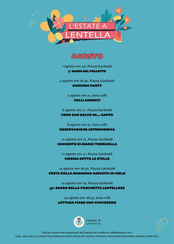 Tutti gli eventi sono organizzati dal Comune di Lentella in collaborazione con: Coop. (geco Service, Street Food Adelante,Centro Sociale SS. Cosma e Damiano, Parrocchia Santa Maria Assunta e ASD M.R.