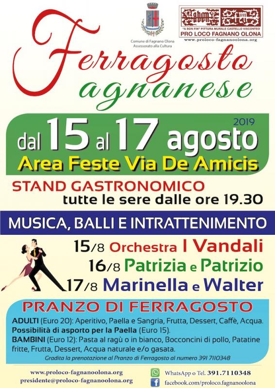 La Pro Loco Fagnano Olona organizza il tradizionale appuntamento del Ferragosto Fagnanese per allietare i cittadini durante i giorni di festa, presso la struttura dell’Area feste in Via De Amicis a Fagnano Olona dal 15 al 17 agosto 2019.