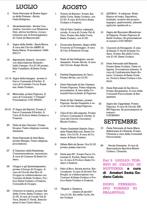Musica e minestrone - due appuntamenti tradizionali e immancabili dell'estate sestagodanese. Il primo - a cura di Banda G.Verdi - il Concerto di Ferragosto presso Aia della Corte alle ore 21: Il secondo appuntamento di questa vigilia di ferragosto è invece a Pignona frazione di Sesta Godano - da non confondere con Pignone, comune della provincia spezzina - che ci delizia con la sua tradizionale Sagra del Rinomato Minestrone di Pignona.