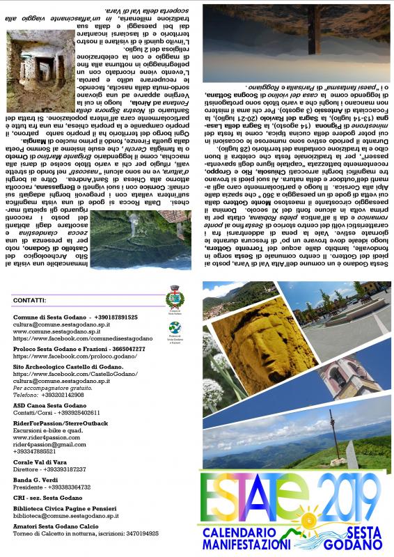 Neppure a ferragosto ci si riposa a Sesta Godano in quanto si celebra la Festa Patronale di Santa Maria Assunta, dal pomeriggio Proloco Sesta Godano e Frazioni sarà impegnata nei preparativi e nell'allestimento dei lumini lungo il tratto dell'antica Plebs Robiana. Alla sera processione solenne a cura della Confraternita Nostra Signora del Santo Rosario di Sesta Godano, che vanta attività dal XVII secolo. Alla processione come di consueto saranno presenti le confraternite del territorio con i loro crocifissi artistici. Al termine spettacolo di luci e Laser a cura di Proloco Sesta Godano e Frazioni.