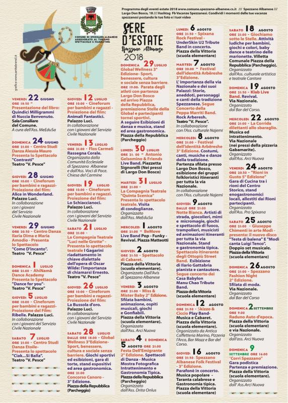 «Grazie al lavoro svolto nei mesi precedenti alla realizzazione del cartellone -dice Gazzarano-, attraverso il costituito Forum delle Associazioni (denominato “Energie per Spezzano Albanese”), è stato possibile realizzare manifestazioni di qualità. Per questo ringrazio tutte le associazioni che hanno aderito con le loro proposte. “Sere d'Estate” è un cartellone variegato e per tutti i gusti. Dal 21 giugno a settembre tante sono le iniziative che arricchiranno di cultura, musica, colori e allegria tutte le zone del borgo. Fra queste mi piace ricordare la Festa della Musica, gli spettacoli di danza, i tornei sportivi, la rassegna teatrale con gli spettacoli del 21 e 31 luglio al teatro “V. Pesce”, il festival Global Welness del 28-29 luglio, la Festa dell'Emigrante del 4-5 agosto, “Spixana Rock Festival” il 6 agosto, il Festival dell'Identità Arbëreshe del 7-8 agosto, la Notte Bianca del 9 agosto, “Spezzano Albanese Folk Festival” del 16 agosto con i Parafonè, e tante altre iniziative. Il mio ringraziamento va a tutti coloro che hanno contribuito alla realizzazione del Cartellone estivo, invito a partecipare e visitare Spezzano nelle “Sere d'Estate”».