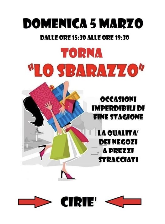In occasione della consueta iniziativa commerciale “Lo Sbarazzo” che avrà luogo domenica 5 marzo 2023, i commercianti al dettaglio del settore non alimentare con sede nell’area pedonale del centro storico cittadino (via Vittorio Emanuele II, via San Ciriaco, via Fiera, via Don Lorenzo Giordano e via San Sudario), potranno occupare gli spazi antistanti le vetrine del proprio esercizio commerciale con esposizione dei propri prodotti, richiedendo autorizzazione all’occupazione suolo pubblico in via semplificata mediante invio all’indirizzo PEC suap.cirie@pec.it , entro mercoledì 1° marzo 2023, dell’apposito modello nel rispetto delle prescrizioni dettagliate nello stesso.