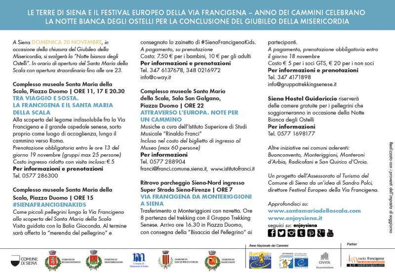 Si intitola ‘Notte bianca degli ostelli’ e si svolgerà a Siena con una giornata di eventi per celebrare la conclusione del Giubileo della Misericordia all’insegna dell’accoglienza e dell’ospitalità. Domenica 20 novembre, presso il Santa Maria della Scala in Piazza Duomo, dalla mattina fino alle ore 23, si susseguiranno passeggiate, performance musicali, visite guidate per grandi e bambini organizzate dall’assessorato al turismo del Comune di Siena in collaborazione con il Festival Europeo della Via Francigena e il Santa Maria della Scala.