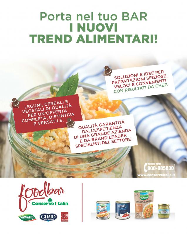 “Il bar sta cambiando pelle – afferma Gabriele Angeli Direttore Marketing Horeca di Conserve Italia – trasformandosi sempre più spesso in bar multifunzionale, che non è più luogo di consumo esclusivo della colazione, del caffè o al massimo dell’aperitivo ‘all’italiana’, ma sempre di più luogo dove si consuma un pranzo veloce in alternativa alla ristorazione classica. Per gli operatori dell’Horeca è fondamentale intercettare le esigenze del nuovo consumatore, sempre più alla ricerca di soluzioni gustose ma leggere che rispondono all’esigenza di nutrirsi in modo più sano”.